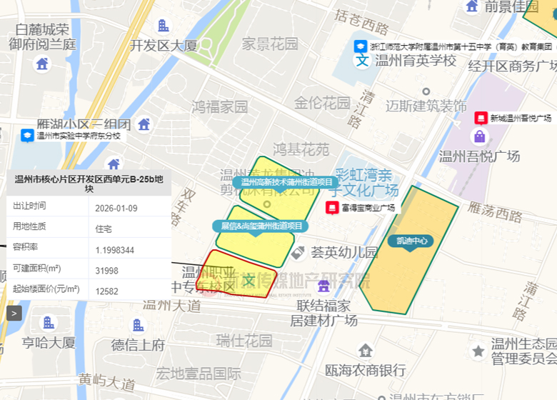 温州市核心片区开发区西单元B-25b地块,容积率1.2,可建面积31998㎡,起始楼面价12582元/㎡,该地块不得建设别墅、“私家庄园”类等房地产项目,不得规划建设独栋住宅。[ 详细阅读 ]